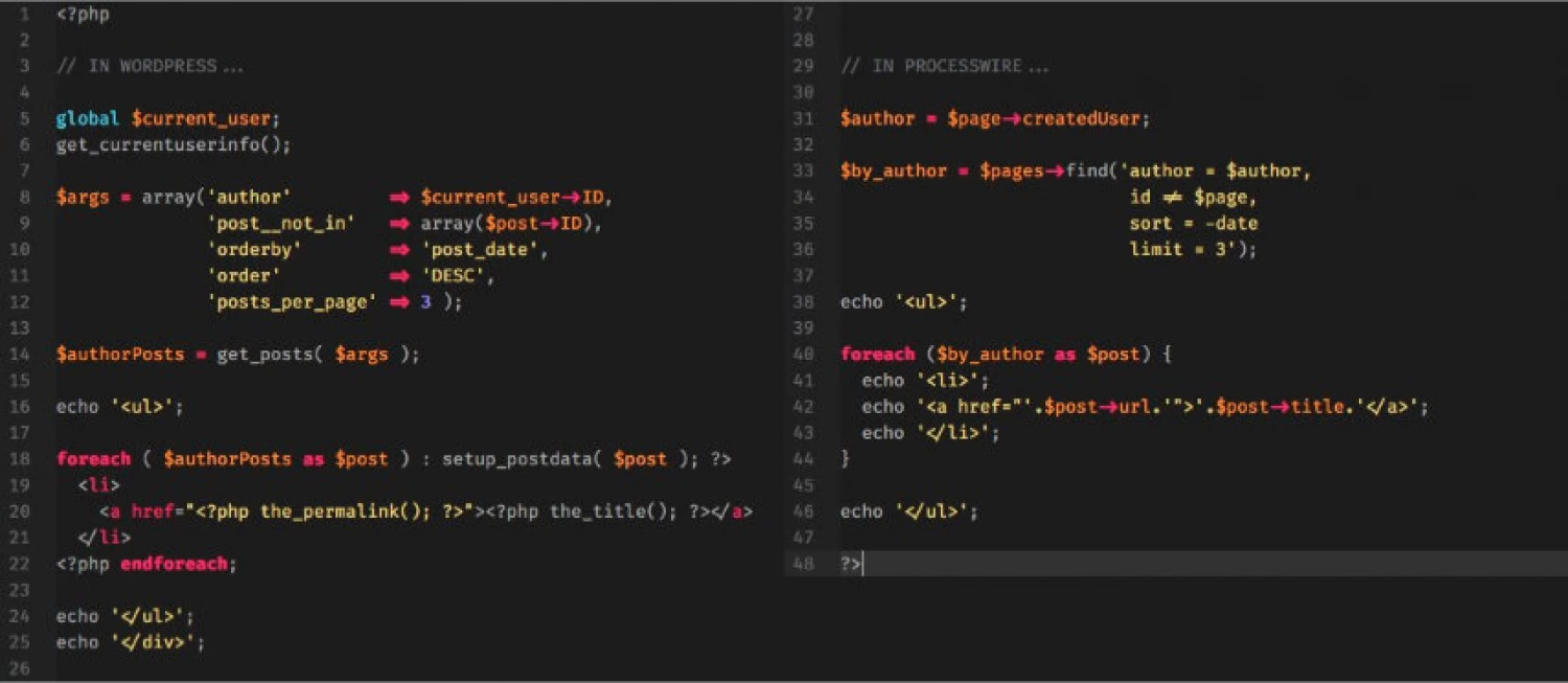 Exhibit three. Same site. I had to rewrite a page template to display other articles by the same author at the end of the page. After doing it, I was so appalled by how dirty that code was that I went and wrote the same thing in ProcessWire. Here’s a side-by-side comparison: