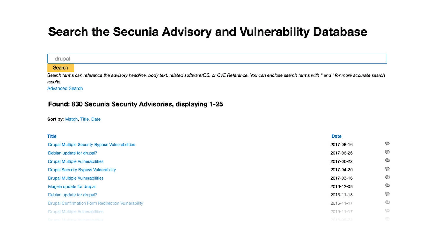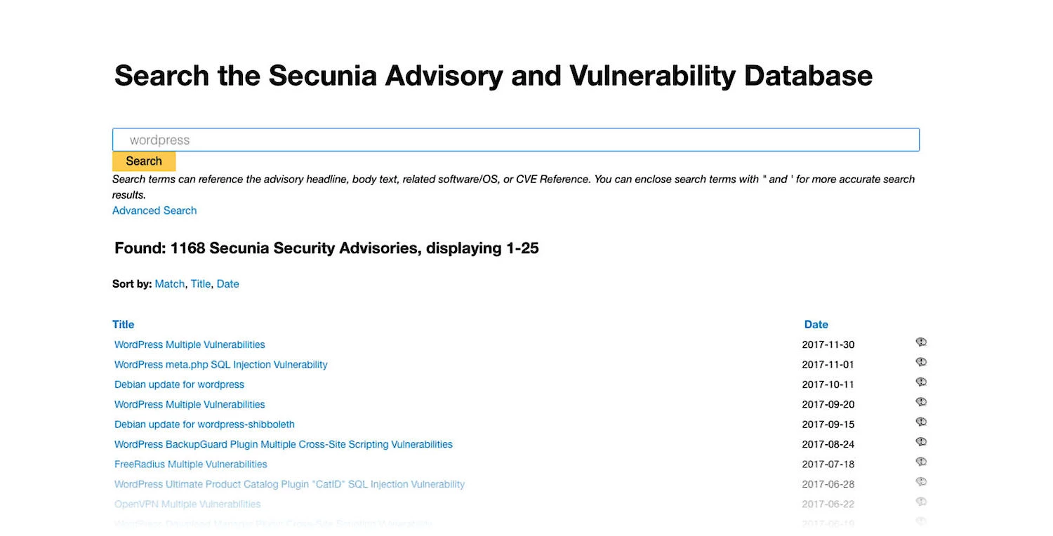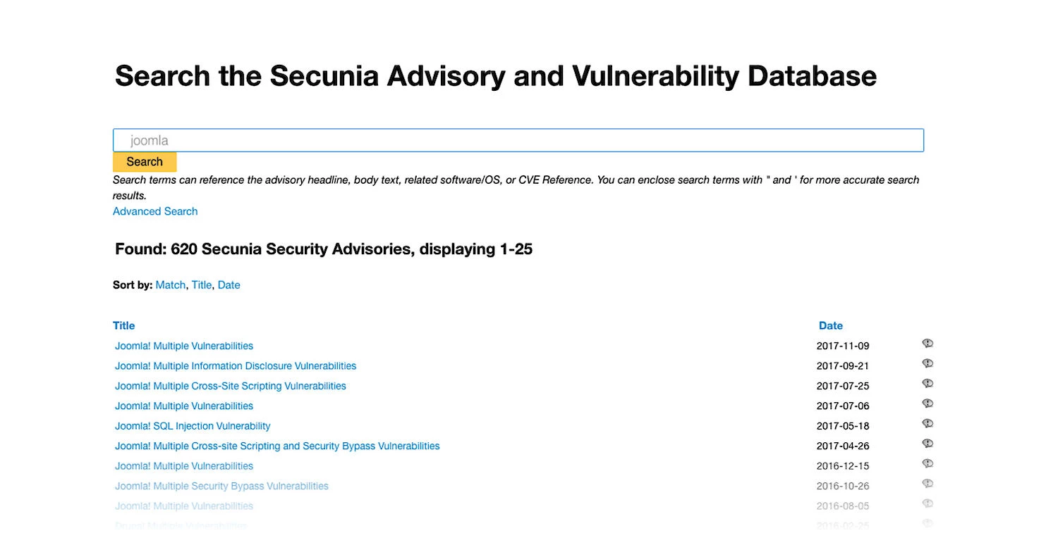 Googling your platform's name and the world "vulnerability" will probably get you some good info right away. But there are companies that track this kind of problems and maintain updated lists of known issues. One of this companies is Flexera Software, who offer the Secunia Research Advisory Database, which is a community driven effort that according to them is "The World’s Premier Vulnerability Intelligence Resource". I've registered and gave it a spin looking up the 3 biggest names in the CMS space to see what pops up: Wordpress, Drupal and Joomla. And of course, being a ProcessWire fanboy, I'll see how it compares to the bunch - he says rubbing his hands.
