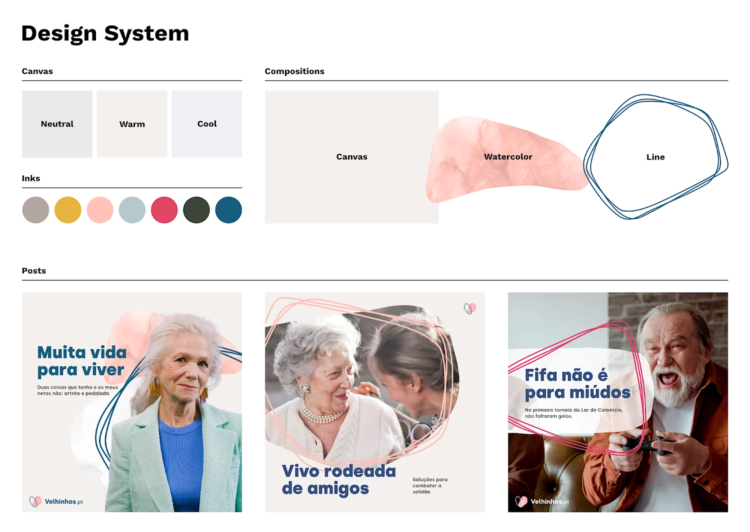 Velhinhos is a service that connects the elderly with caregivers. In this project we started by helping establish the name, then developed the brand identity, design system, communication and website, closing the circle of the company's marketing strategy. In the end, we delivered a complete toolkit that allowed the business activation, communication and sales.